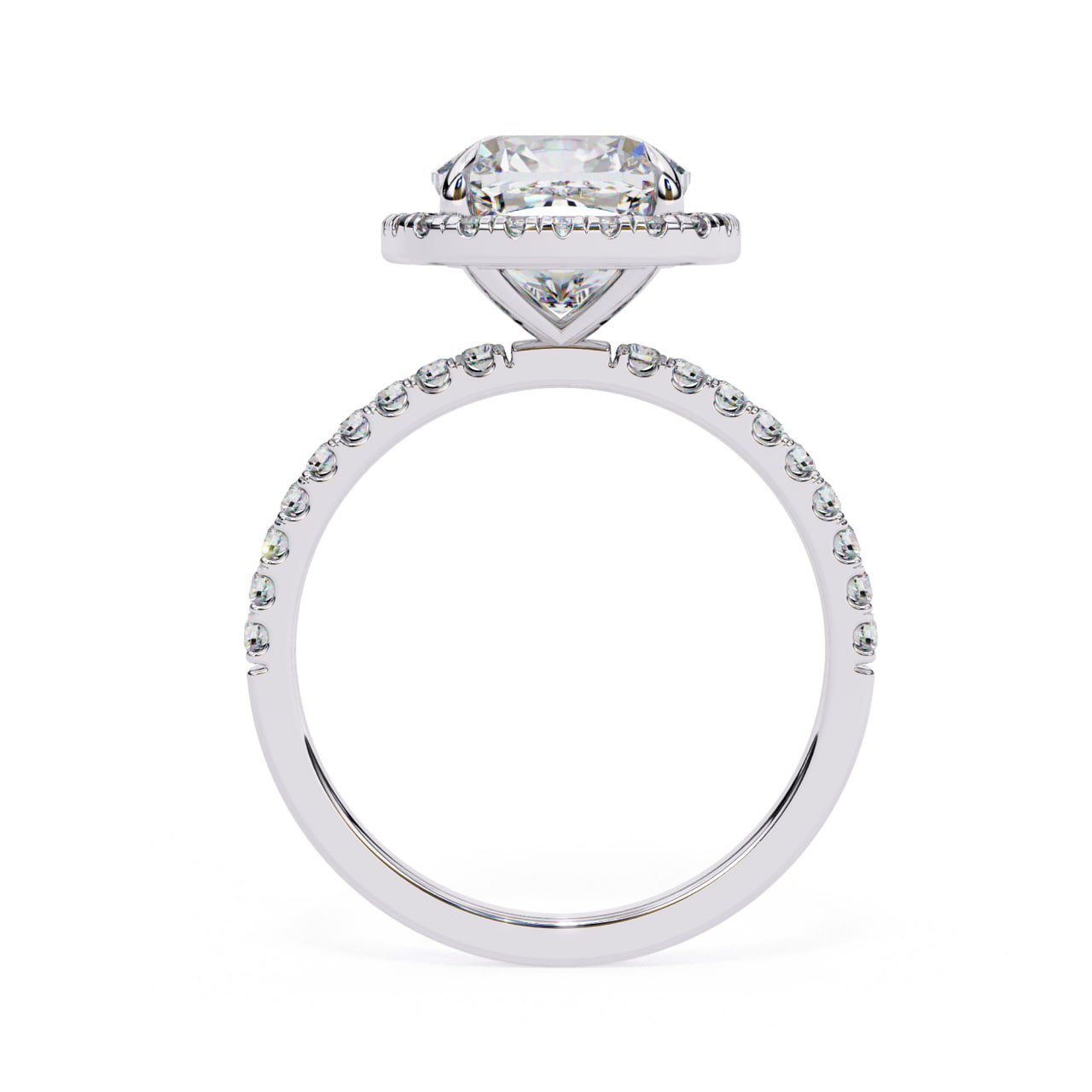 - Setting Style: Four‑prong halo setting with pave accent stones on the shank.