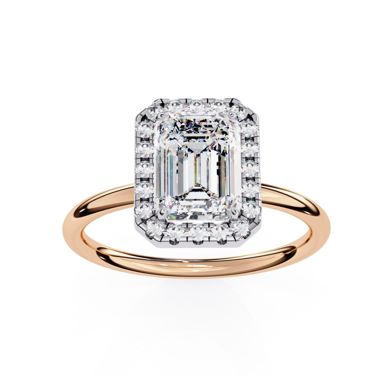 SKU : R120This luxurious Emerald Cut Halo Diamond Ring features a breathtaking emerald-cut center diamond framed by a radiant halo of round brilliant diamonds. The step-cut center stone delivers timeless elegance and exceptional clarity, while the halo enhances brilliance and presence. Set on a sleek polished band, this ring is a perfect blend of modern sophistication and classic luxury—ideal for engagements, anniversaries, and statement gifting.