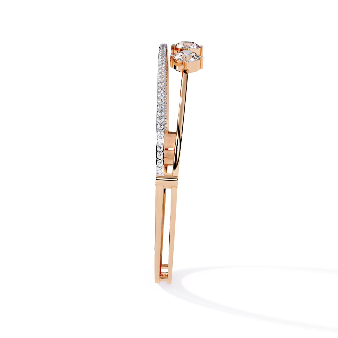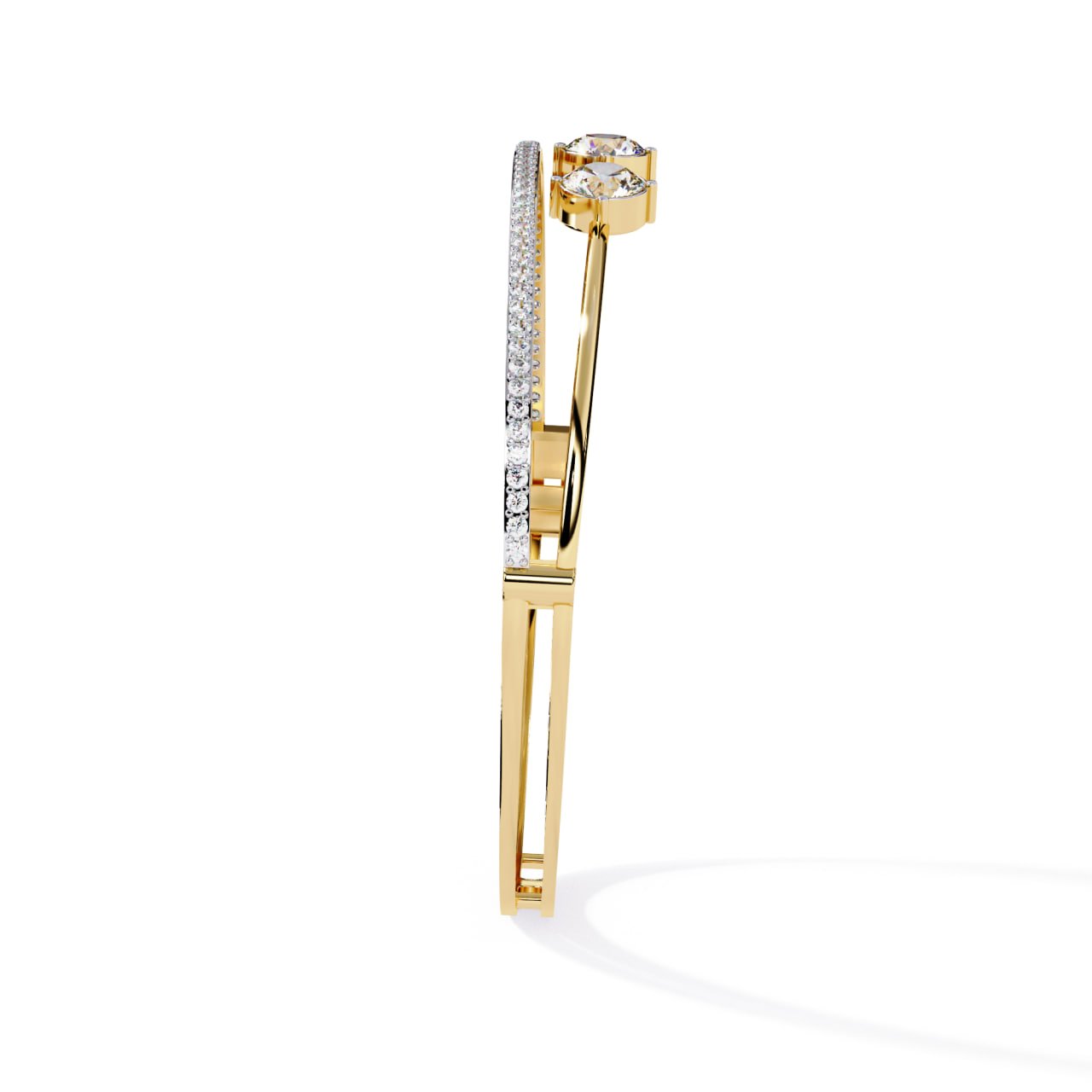 SKU : B011This Four-Stone Diamond Elegance Bracelet is a refined expression of modern luxury and minimal sophistication. Designed with four perfectly aligned round-cut diamonds at the center, the bracelet symbolizes balance, harmony, and timeless beauty. A sleek gold structure is complemented by a delicate pavé diamond strip beneath the center stones, adding subtle brilliance without overpowering the design. Crafted for everyday elegance as well as special occasions, this bracelet offers a lightweight yet premium feel, making it an ideal choice for contemporary fine jewelry lovers.