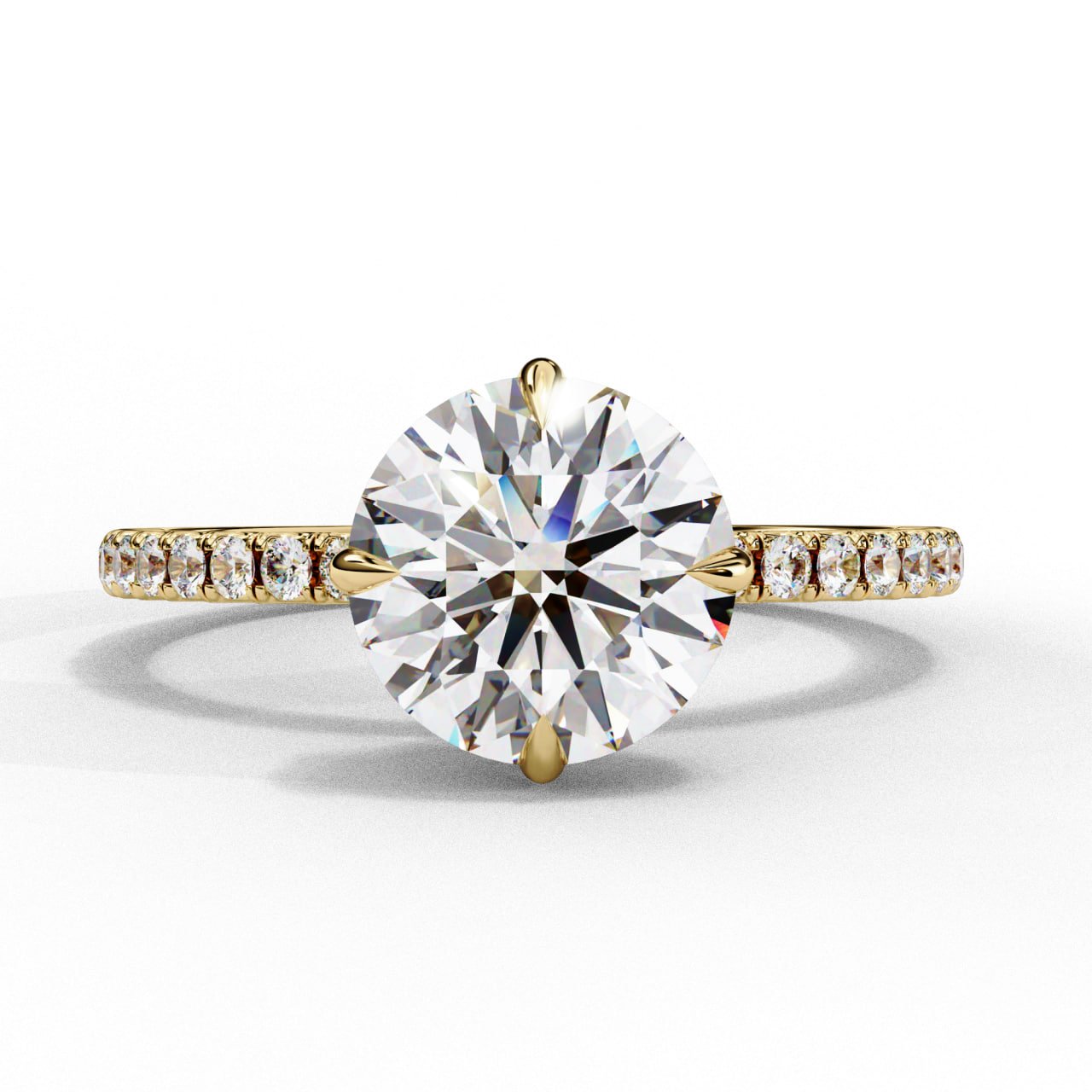 SKU : R-005Round Cut Diamond Engagement Ring – Pavé Band Classic This timeless Round Brilliant Cut Diamond Engagement Ring is designed to showcase maximum sparkle with refined elegance. The center diamond is securely held in a four-prong solitaire setting, allowing optimal light entry and exceptional brilliance. A delicate pavé-set diamond band enhances the ring with continuous shimmer while keeping a slim, elegant profile. Crafted for comfort and durability, this ring is ideal for daily wear and lifelong commitment—perfect for proposals, weddings, and luxury bridal collections.