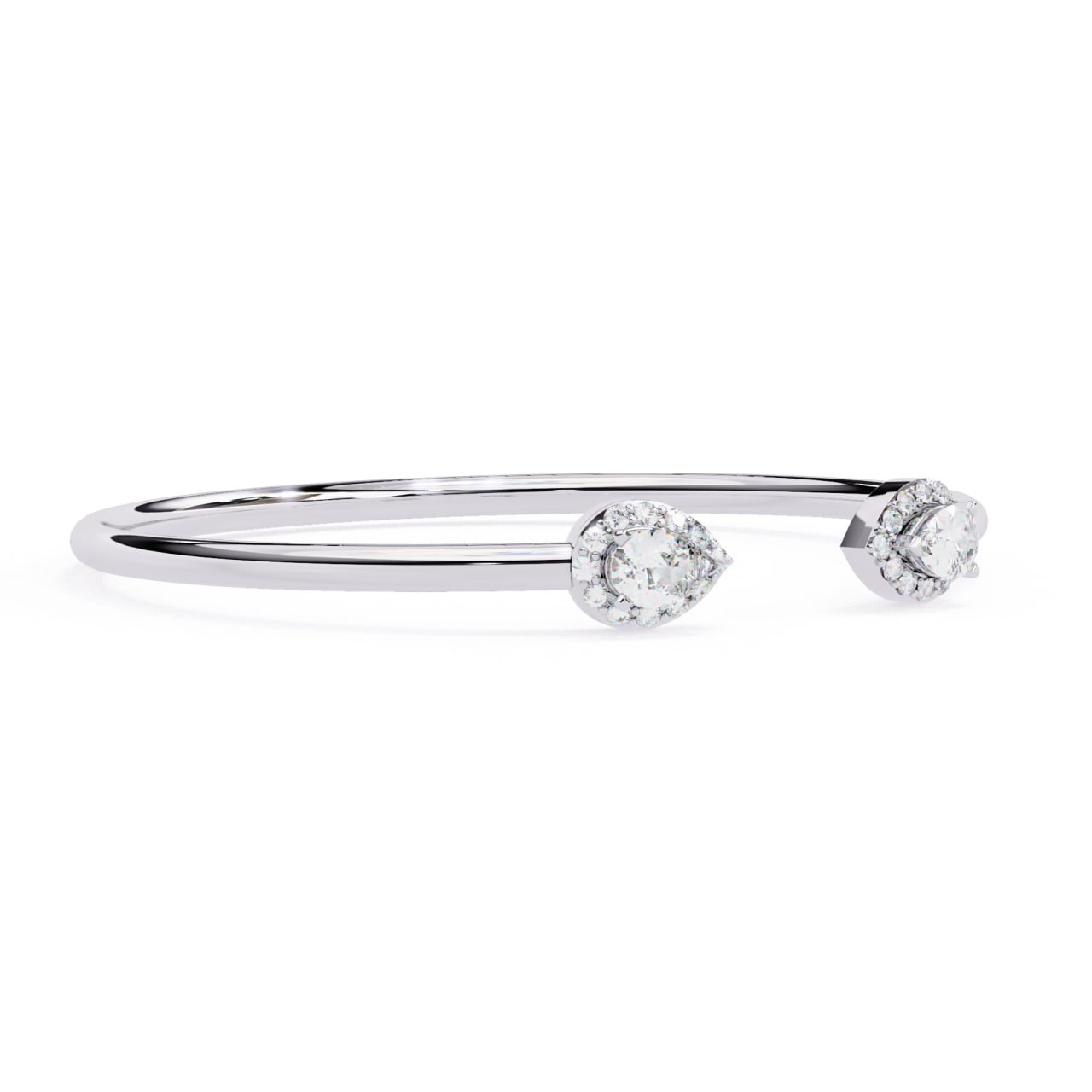 SKU : B003This contemporary open bangle bracelet features two opposing pear-shaped halo diamond clusters, creating a sleek yet luxurious silhouette. Designed to make a refined statement, the minimal gold band offers flexibility and comfort, while the halos add a brilliant sparkle from every angle. Ideal for both daily wear and special occasions, this modern diamond bangle layers beautifully with watches or stackable bracelets.