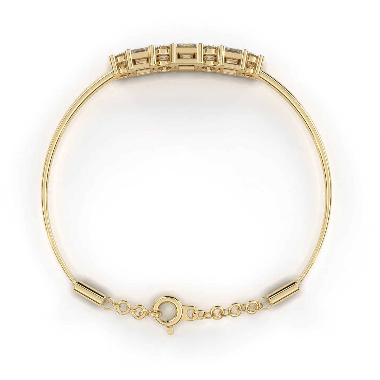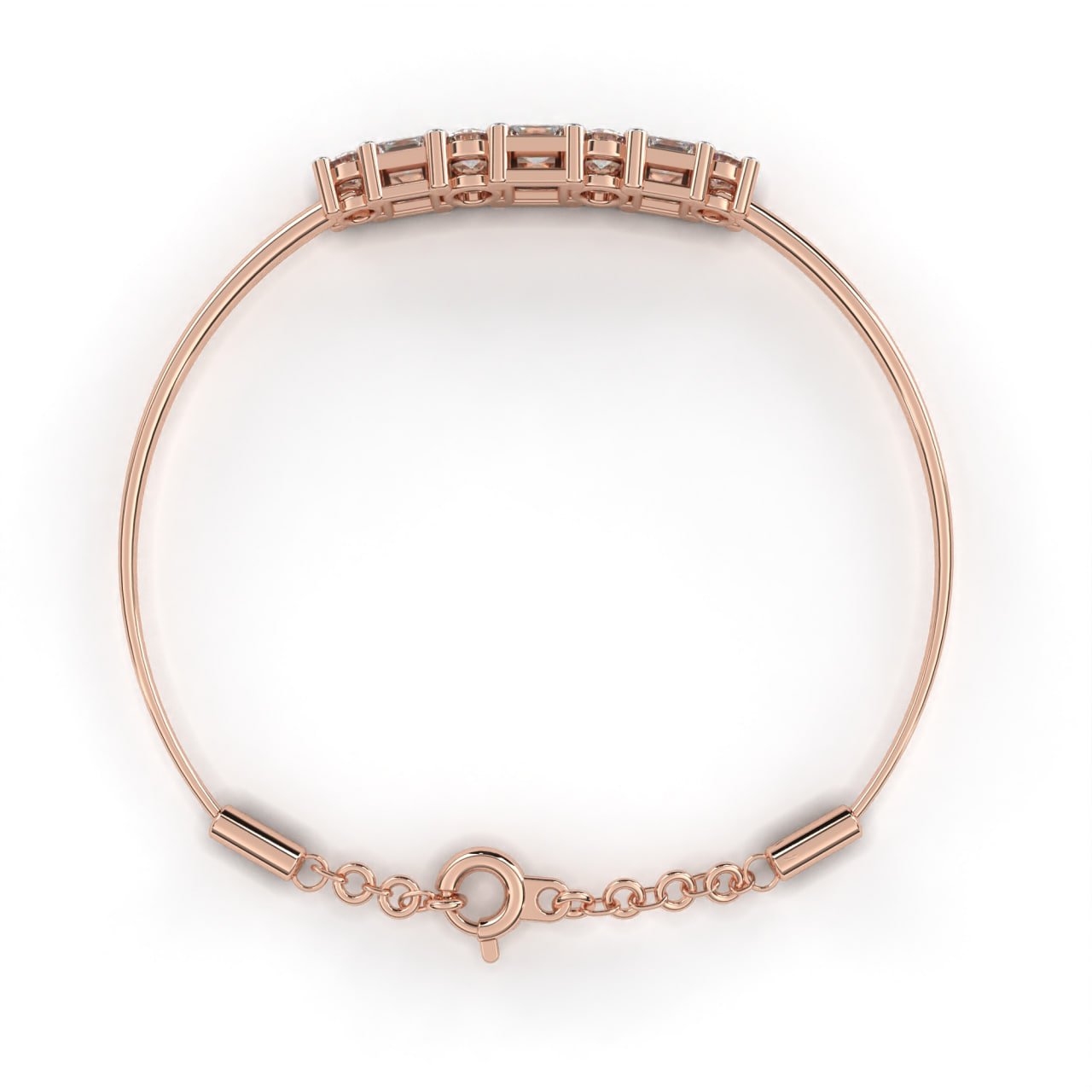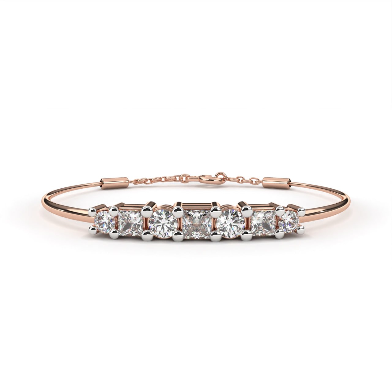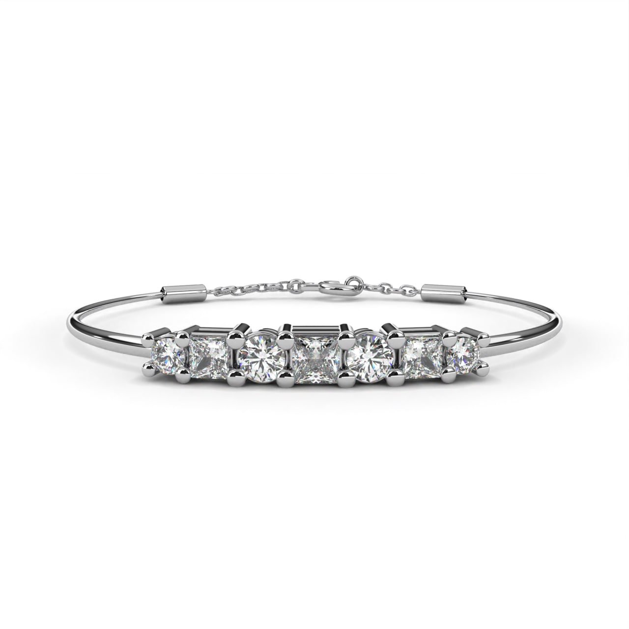 SKU : B013A refined modern semi-bangle bracelet featuring alternating princess-cut and round brilliant diamonds, prong-set in an elevated bar design for maximum brilliance. The dual-shape layout creates a dynamic rhythm of light, while the two-tone metal accent adds contrast and sophistication. Designed with a flexible cable closure and safety chain for ease of wear, this bracelet transitions seamlessly from everyday style to evening elegance—perfect for stacking with bangles or wearing solo as a statement piece.