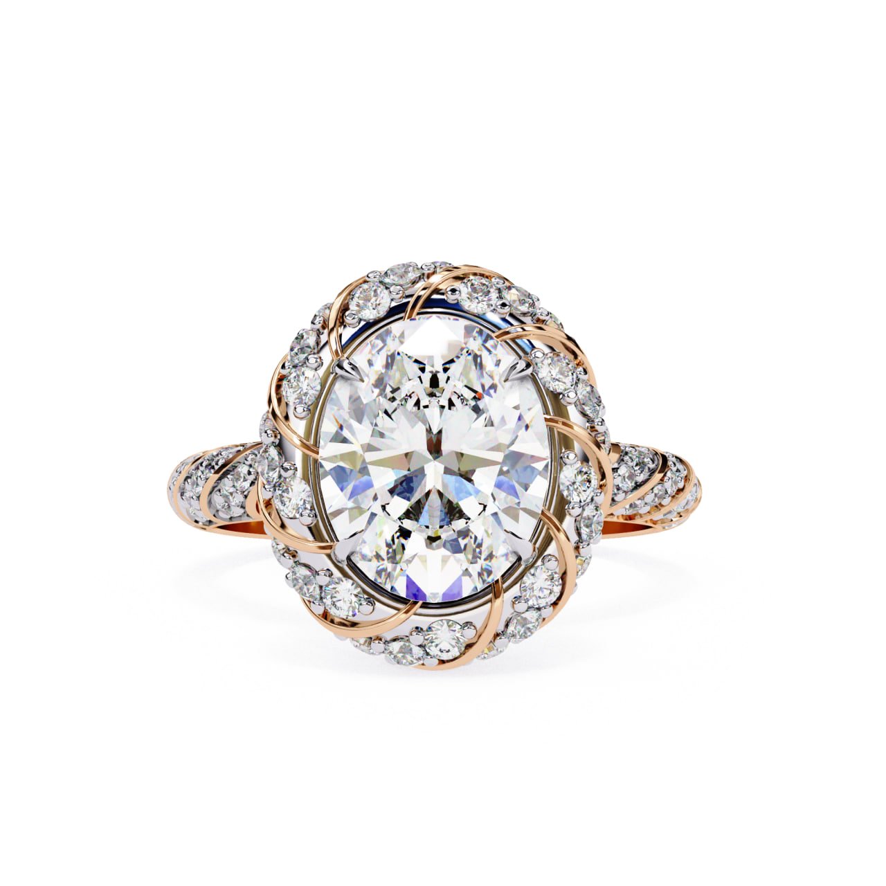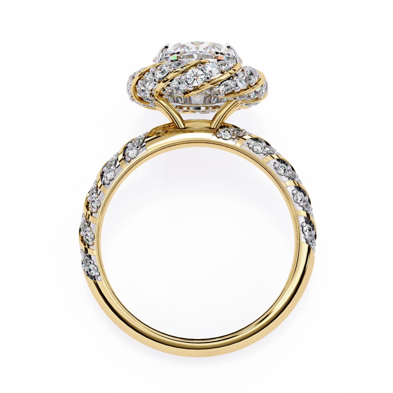 SKU : R197This luxurious vintage-inspired halo diamond ring features a stunning oval-cut center diamond, beautifully surrounded by an intricate swirl halo of round brilliant diamonds. The detailed split shank is adorned with pavé-set diamonds, adding exceptional sparkle from every angle. Crafted in polished yellow gold, this ring blends classic elegance with artistic detailing, making it a perfect choice for engagements and statement occasions.